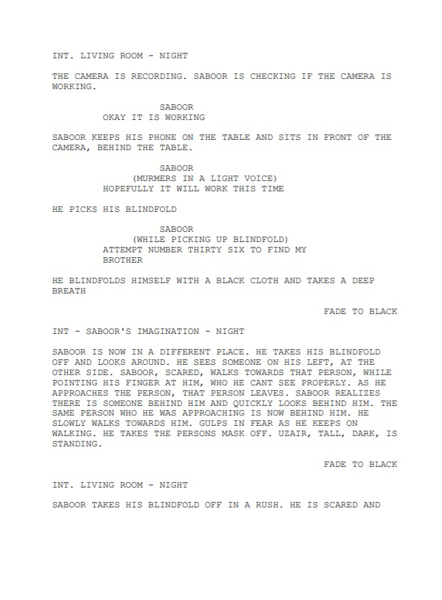 SABOOR IS NOW IN A DIFFERENT PLACE. HE TAKES HIS BLINDFOLD OFF AND LOOKS AROUND. HE SEES SOMEONE ON HIS LEFT, AT THE OTHER SIDE. SABOOR, SCARED, WALKS TOWARDS THAT PERSON, WHILE POINTING HIS FINGER AT HIM, WHO HE CANT SEE PROPERLY. AS HE APPROACHES THE PERSON, THAT PERSON LEAVES. SABOOR REALIZES THERE IS SOMEONE BEHIND HIM AND QUICKLY LOOKS BEHIND HIM. THE SAME PERSON WHO HE WAS APPROACHING IS NOW BEHIND HIM. HE SLOWLY WALKS TOWARDS HIM. GULPS IN FEAR AS HE KEEPS ON WALKING. HE TAKES THE PERSONS MASK OFF. UZAIR, TALL, DARK, IS STANDING.